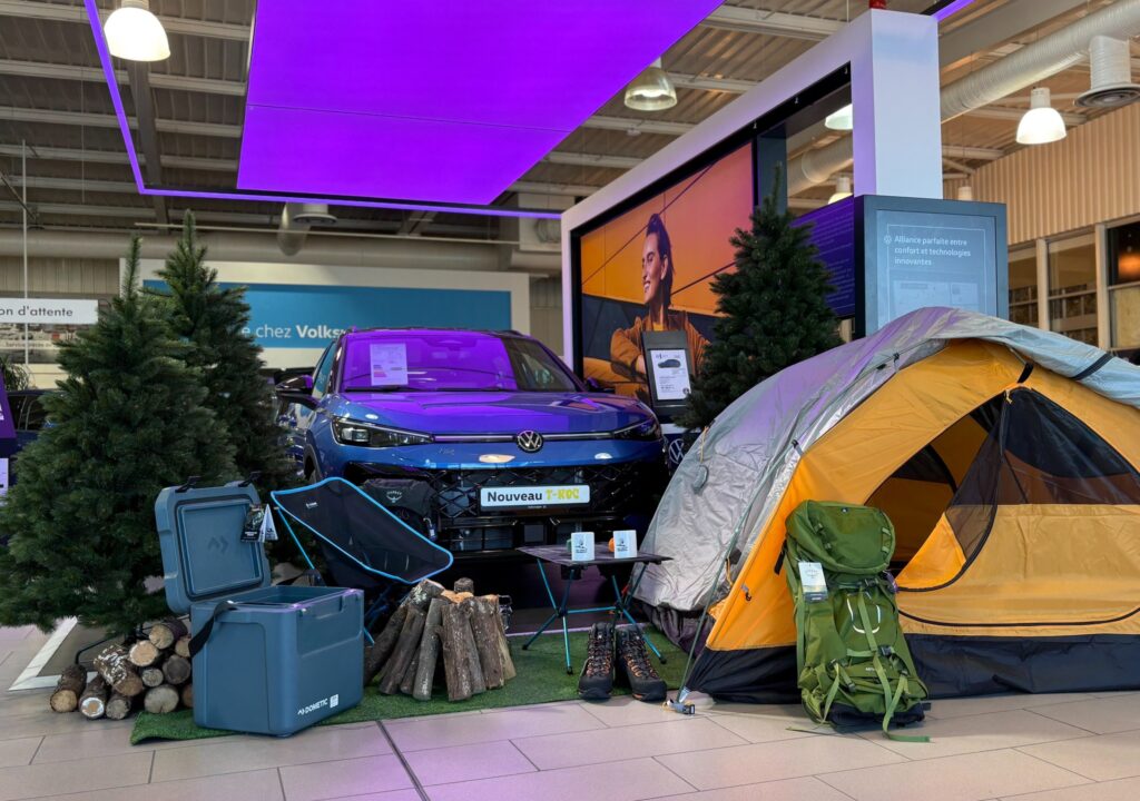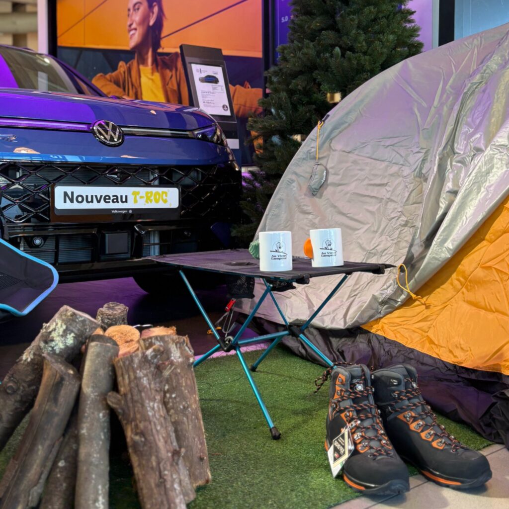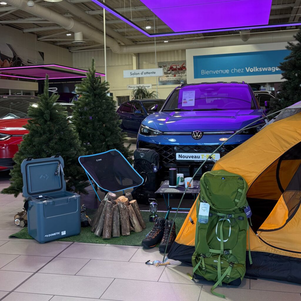 Pour nos Journées Portes Ouvertes de ce mois de mars, nous avons décidé de faire souffler un vent de fraîcheur sur nos showrooms bordelais en concrétisant une belle collaboration avec l’enseigne Au Vieux Campeur. Afin de célébrer le retour du printemps et d’offrir une expérience originale à nos clients, nous avons travaillé à la mise en place d’un décor immersif sur le thème de la randonnée et du bivouac. Nous avons soigneusement mis en scène une sélection d’articles de plein air au cœur de nos espaces pour créer une véritable invitation à l’évasion. Cette initiative scénographique nous permet de dynamiser l’expérience en concession pendant ces JPO et de surprendre nos visiteurs avec une ambiance « grand air » totalement inédite pour notre marque !